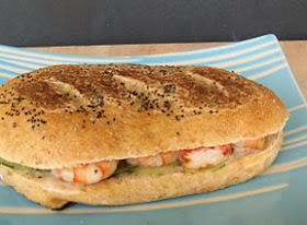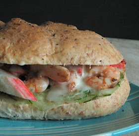 A sub from the sea. Peppery shrimp and surimi sandwich, thick and oozing tartar sauce