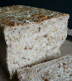 I think it's important to toast the rye and buckwheat before cooking as that gives them a better flavour. A topping of seeds and rolled oats gives the bread a lovely crunch as well. I shaped this loaf in a Pullman loaf pan (right) and that's why the top is flat.