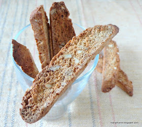 I made the biscotti again, this time, substituting 30g of the flour with the same amount of dessicated coconut, and using chopped walnuts instead of pecans.