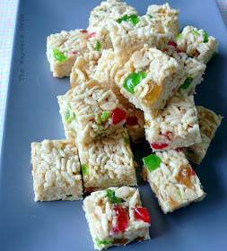 I started out by mixing about 2 cups of crisp rice cereal, and 2 tablespoons each of dessicated coconut and white melon seeds in a bowl. Then in went roughly chopped glacé cherries (five green and two red) along with six pieces of crystallised ginger, also chopped. Everything was mixed well to distribute the ingredients evenly.