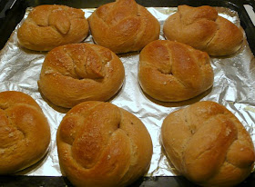 Right, here's the thing about not following recipes. Instead of making 12 pretzels from the dough, I only made eight so that they would fit on just one baking tray. That meant the portions were larger and so when they rose, during proofing and then in the oven, the holes closed up and the pretzels turned into rolls, albeit with a pretty knot pattern on the top as they appear here after being baked:
