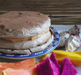 Well, it's not a competition, so there's nothing illegal about it. This time ­­– and it's only my third challenge ­­– I am taking some liberties. First of all, Mascarpone and heavy cream, used in the filling, are expensive items over here and the recipe calls for quite a lot of both ingredients. In addition, I think that pavlovas don't require such a rich filling since they're sweet on their own. So I decided to make it in three layers, fill it with coffee custard (recipe below), dust the top with cocoa powder and serve it with local fruit.
