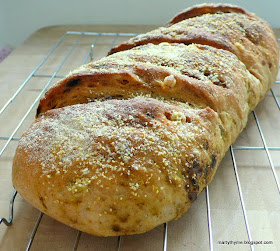 The corn in the bread's name is in the form of kernels. I used dried multi-coloured corn kernels ­­– in orange, yellow and purple ­­– and cooked them in a slow cooker for a few hours to soften. I thought they would add a brilliant palette to the bread but as you can see, they didn't exactly keep their colour. Using frozen or fresh corn should be just fine and much easier.