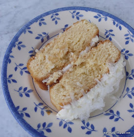 This isn't a large cake. I made two layers in loaf pans and it probably would have been prettier if I had sliced each cake in two to make four layers in all with frosting in between. But it really didn't matter in the end because it was polished off quite quickly! Coconut, aaah...