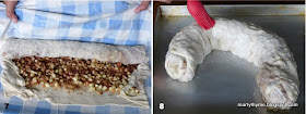 - Lightly brown the breadcrumbs and walnuts in 75g melted butter; spread this mixture evenly over the dough. Sprinkle with the fruit (try not to include too much liquid), then dust with the cinnamon-sugar mixture (Pix 6). Fold the two outer sides in, then, using the tea towel/sheet, roll up the dough carefully to enclose all the ingredients (Pix 7). Slide the strudel on to a buttered baking sheet. Brush with the milk (Pix 8). It's all right if the strudel does not lie straight; it can be curled to fit the tray.