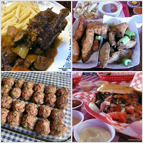 Clockwise from top left: Braised beef short ribs; Smoke Eaters' fried chicken wings and tenders; St John's Bar and Grill tri-tip sandwich; and pork and beef meatballs (uncooked)