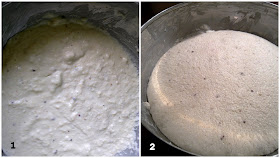 When fermented, the batter will have domed slightly with tiny bubbles on the surface (pic 2). Stir in salt. The batter should have the consistency of pancake batter so if it too thick, add a little water.