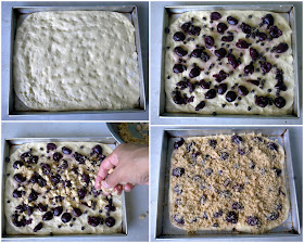 Assemble the kuchen: Lightly oil a 28cm x 24cm baking pan (or equivalent size). Press the dough into the pan. If it resists and springs back, set aside to relax for about five minutes, then continue. Dimple the dough with the fingertips.