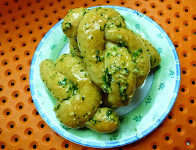 The dough is bulked proofed in a square container so that when it is transferred to the work surface, I don't have to fiddle around with the shape too much (I learnt this from Paul Hollywood's recipe for ciabatta and watching the latest series/season of The Great British Bakeoff). Using a pizza cutter, I divide the dough into 11 strips (the last one was runty!), tie them in knots and bake them for around 25 minutes. I didn't let them get crusty or too brown on top or they wouldn't soak up the garlic-parsley dressing.